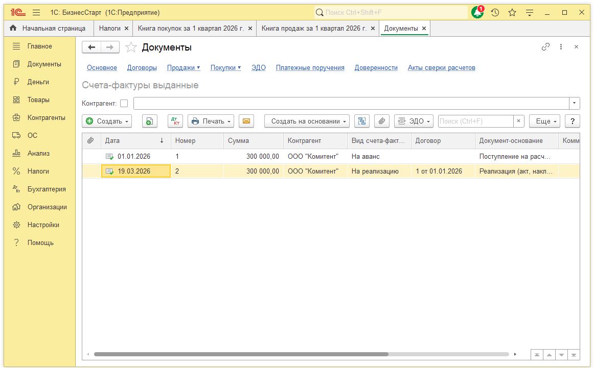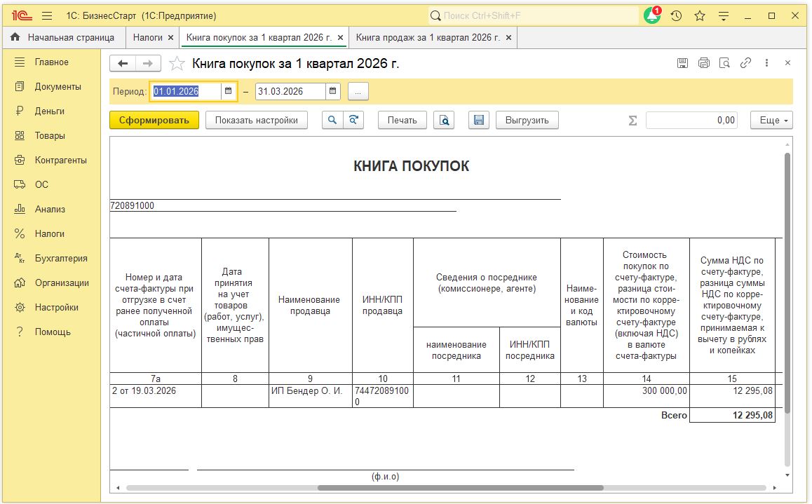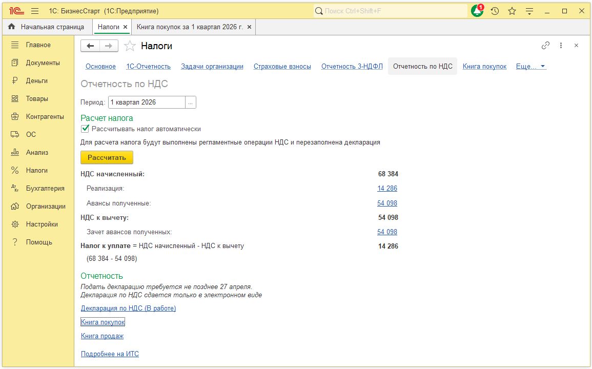 - 1С:БизнесСтарт автоматически сформирует книги покупок и продаж, рассчитает налог и подготовит декларацию для отправки в налоговую.