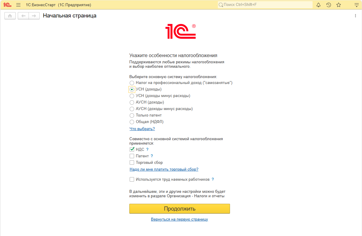Авторасчет налогов в 1С:БизнесСтарт