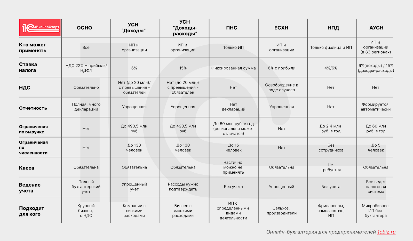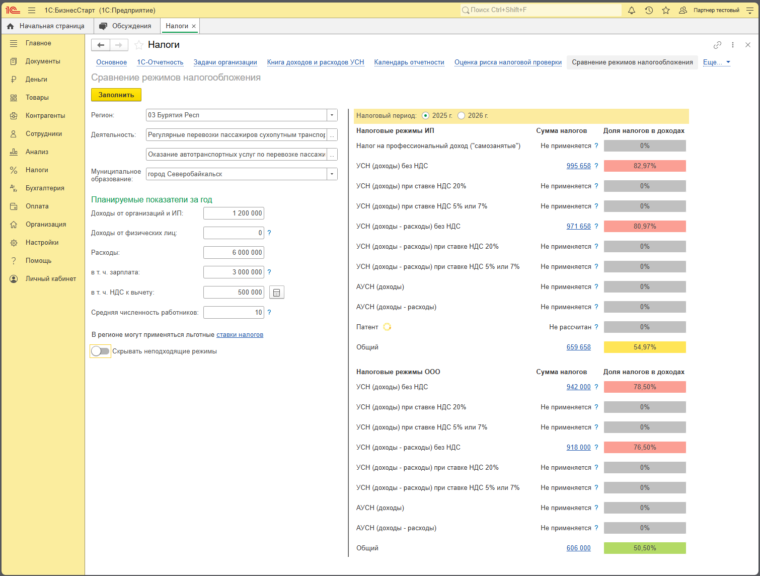В 1С:БизнесСтарт есть бесплатный налоговый калькулятор, который помогает сравнить режимы налогообложения и выбрать оптимальный. Он учитывает изменения 2026 года, включая НДС для упрощенки, ставки налога на прибыль, прогрессивный НДФЛ и другие параметры. Калькулятор позволяет оценивать налоговую нагрузку для ОСНО, УСН («Доходы» и «Доходы минус расходы»), АУСН, ПСН и НПД.